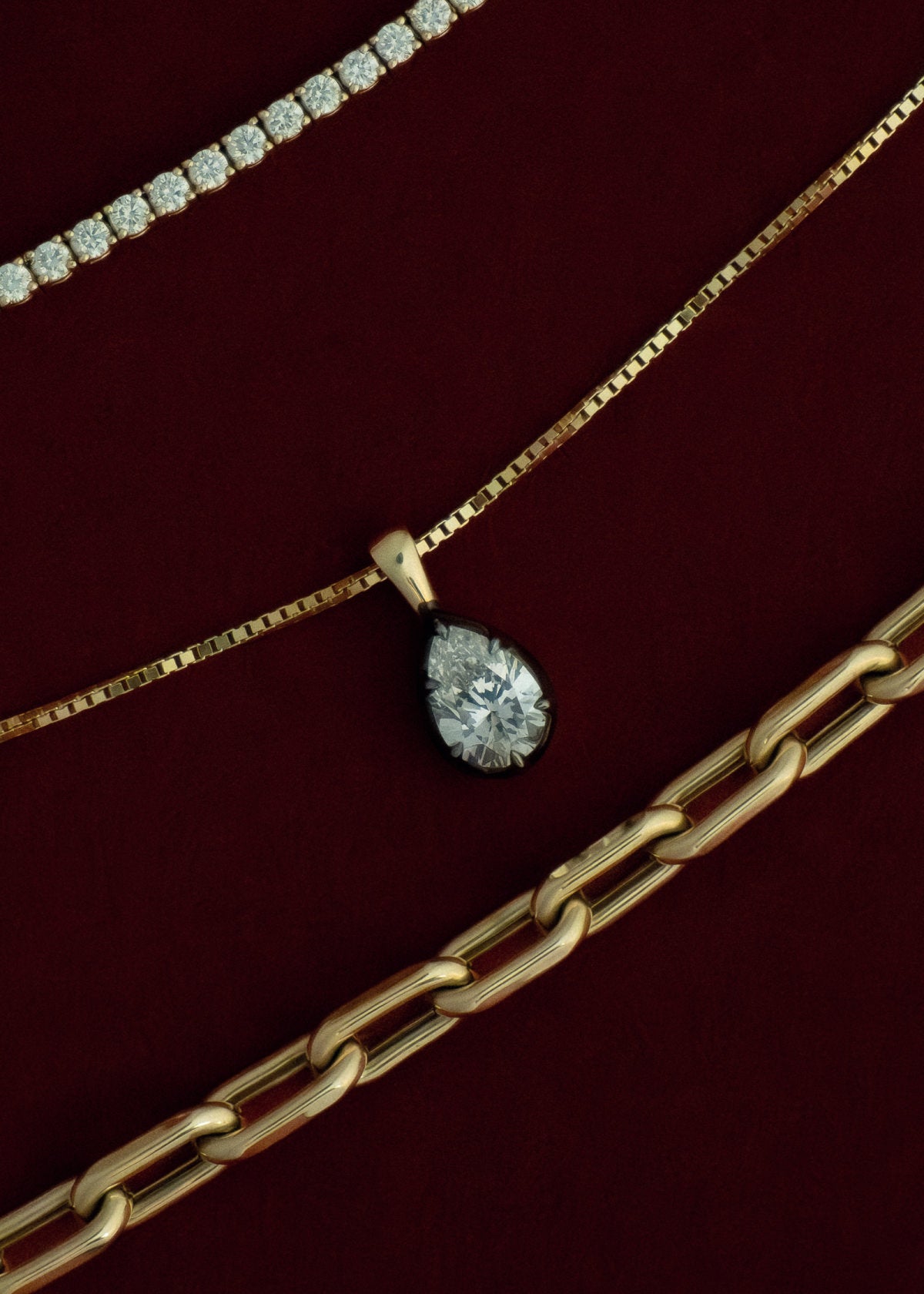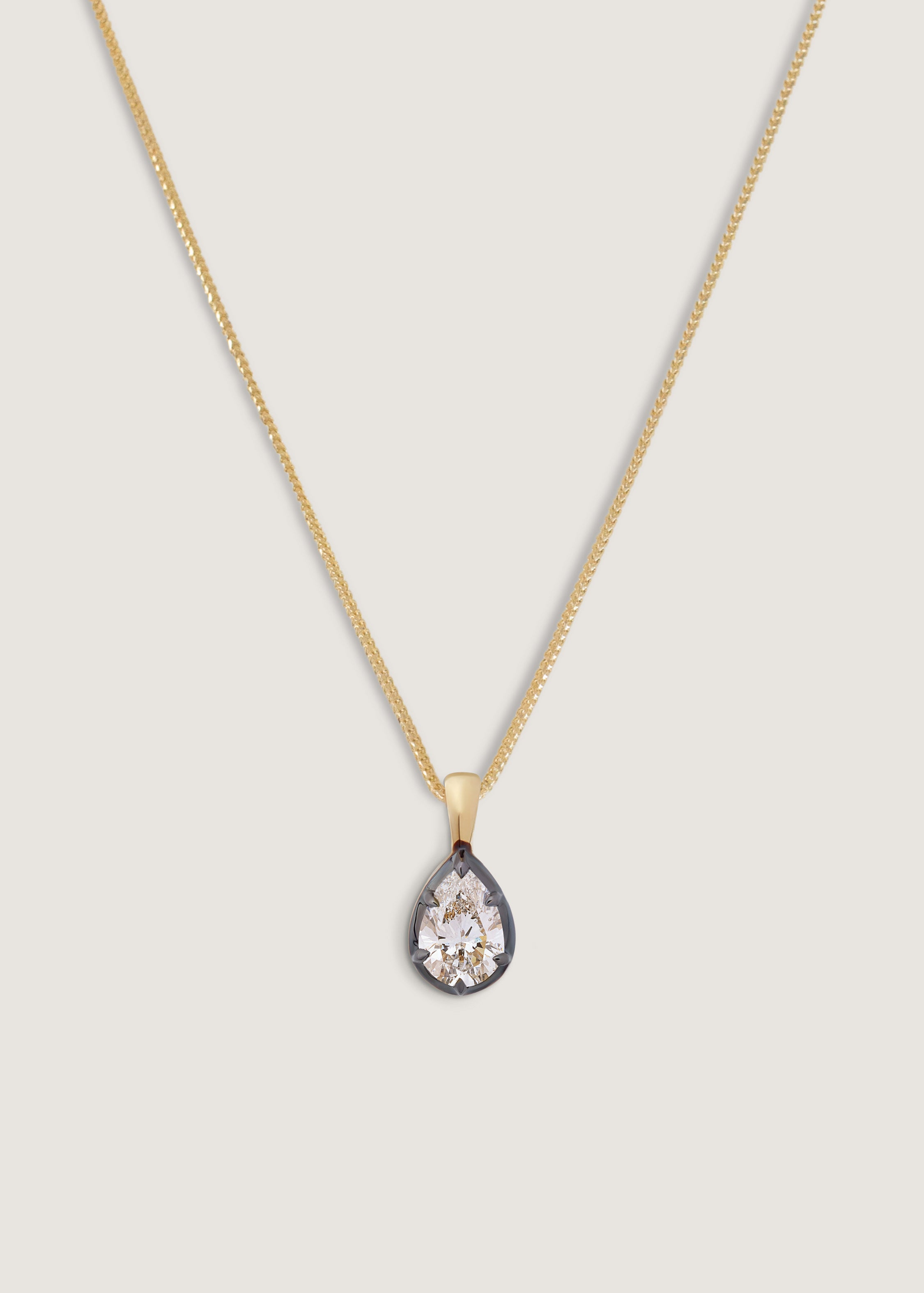 The Clara Pendant features a pear-shaped diamond framed in black rhodium and set in solid 14k gold—an elegant balance of contrast and light. Designed to bring depth and distinction to your everyday layers, it’s a timeless piece that captures quiet strength and enduring beauty.