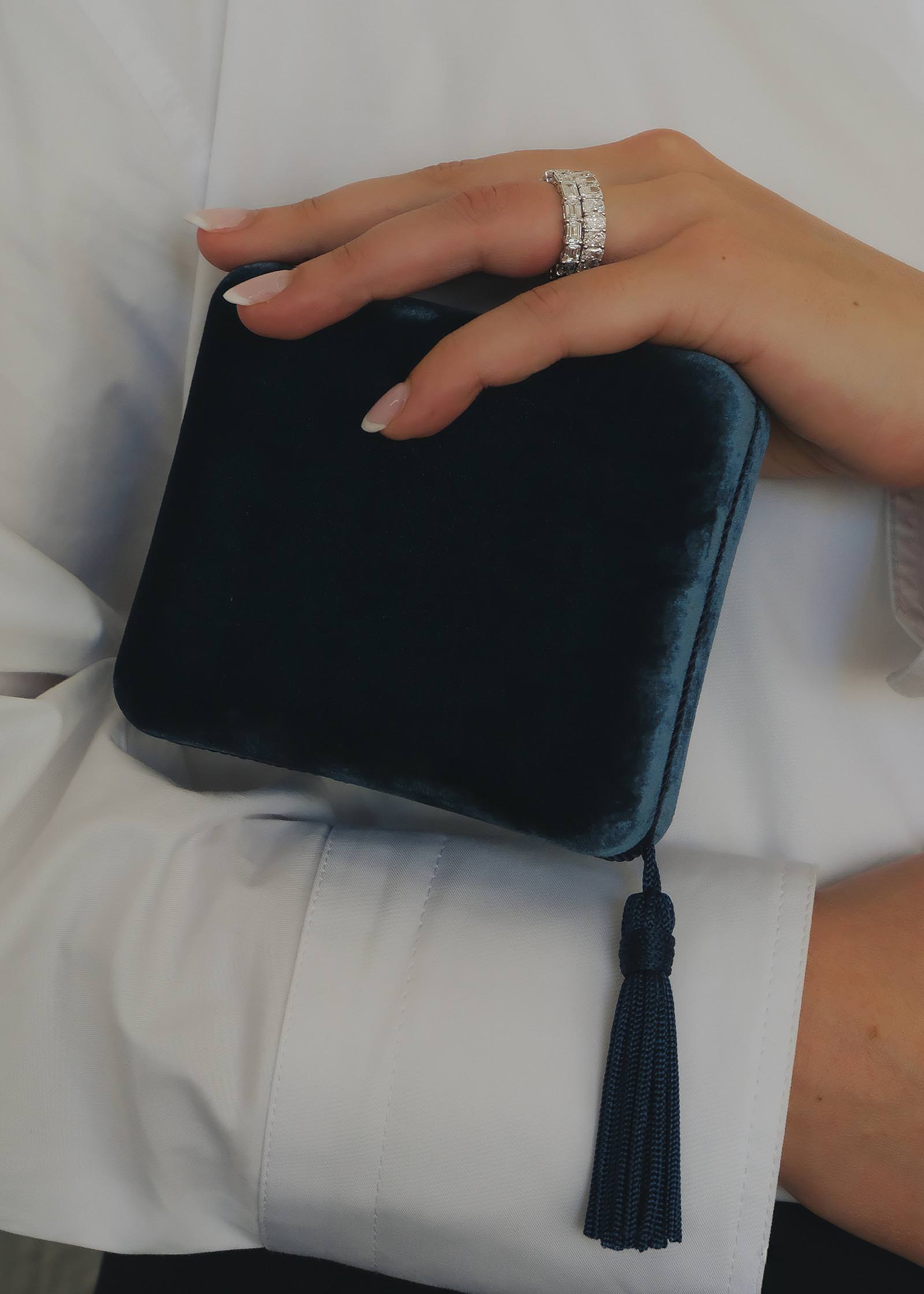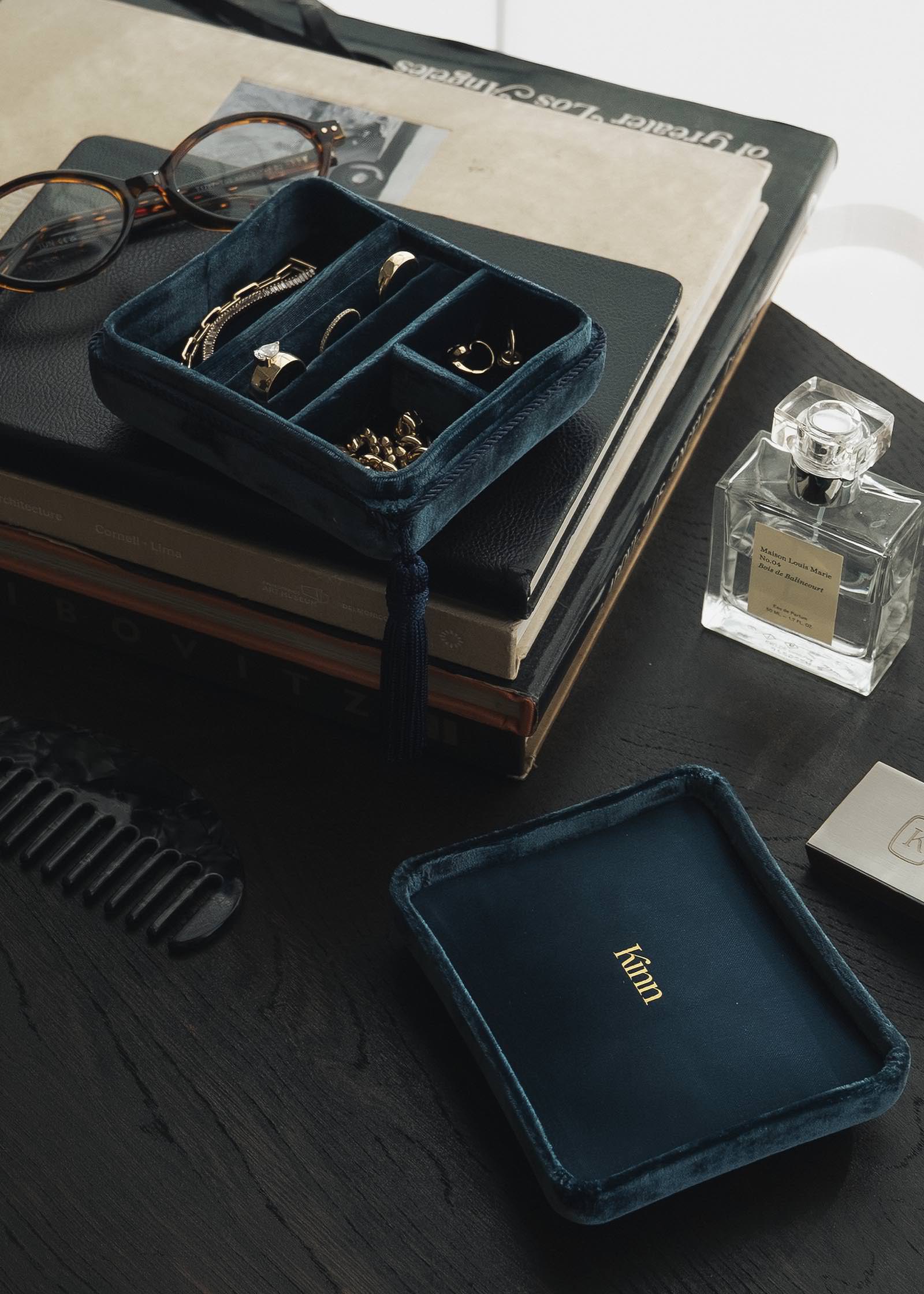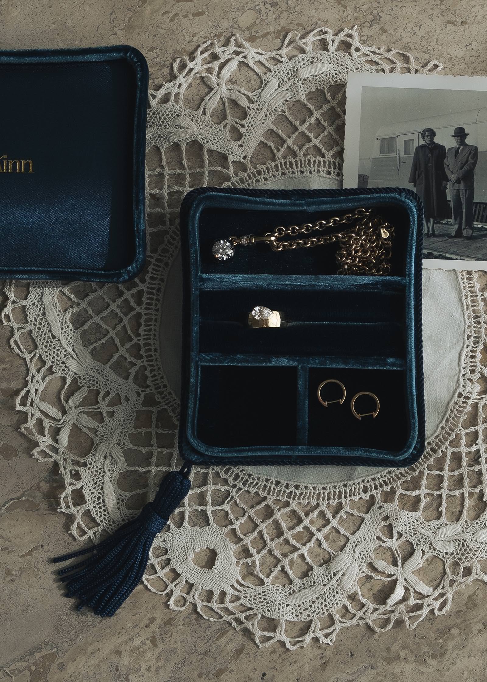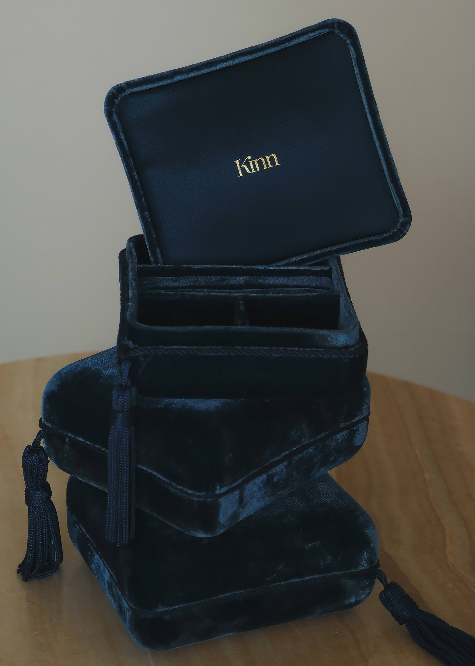 A home for your heirlooms, at last. Designed for both dresser and suitcase, our first-ever Jewelry Box arrives in signature Kinn blue velvet—plush, structured, and finished with a soft tassel and gold-embossed logo inside. Thoughtfully crafted to protect what matters most, it’s a long-awaited piece we’re proud to share in celebration of Kinn’s 8th birthday.