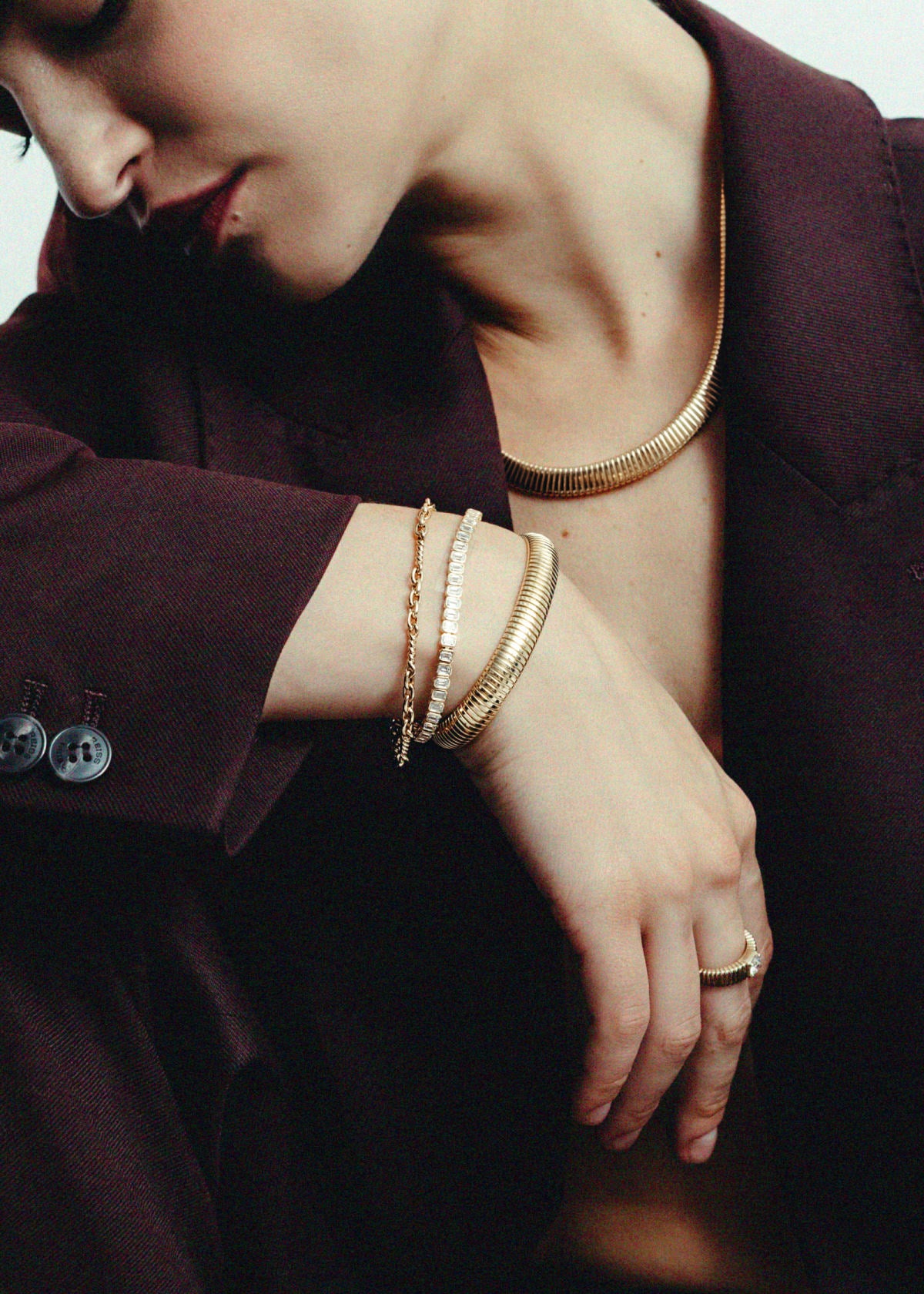 Striking yet timeless, the Nina Bold Tubogas Bracelet embodies confidence in form. Crafted from rounded coils of solid 14k gold, its domed silhouette adds sculptural depth and presence to the wrist. Inspired by vintage Italian goldwork, this bold interpretation of our signature Tubogas design is finished with a hidden butterfly clasp for a smooth, continuous line.