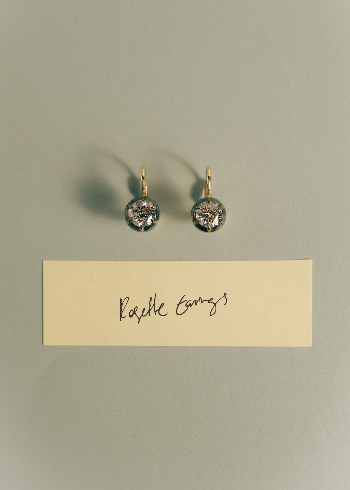 Modern radiance with vintage depth. The Rosette Earrings feature round brilliant diamonds framed in dark rhodium-accented gold, creating a striking contrast that highlights every facet. Suspended from polished gold hooks, the design moves gracefully with the wearer—equal parts bold and refined.
