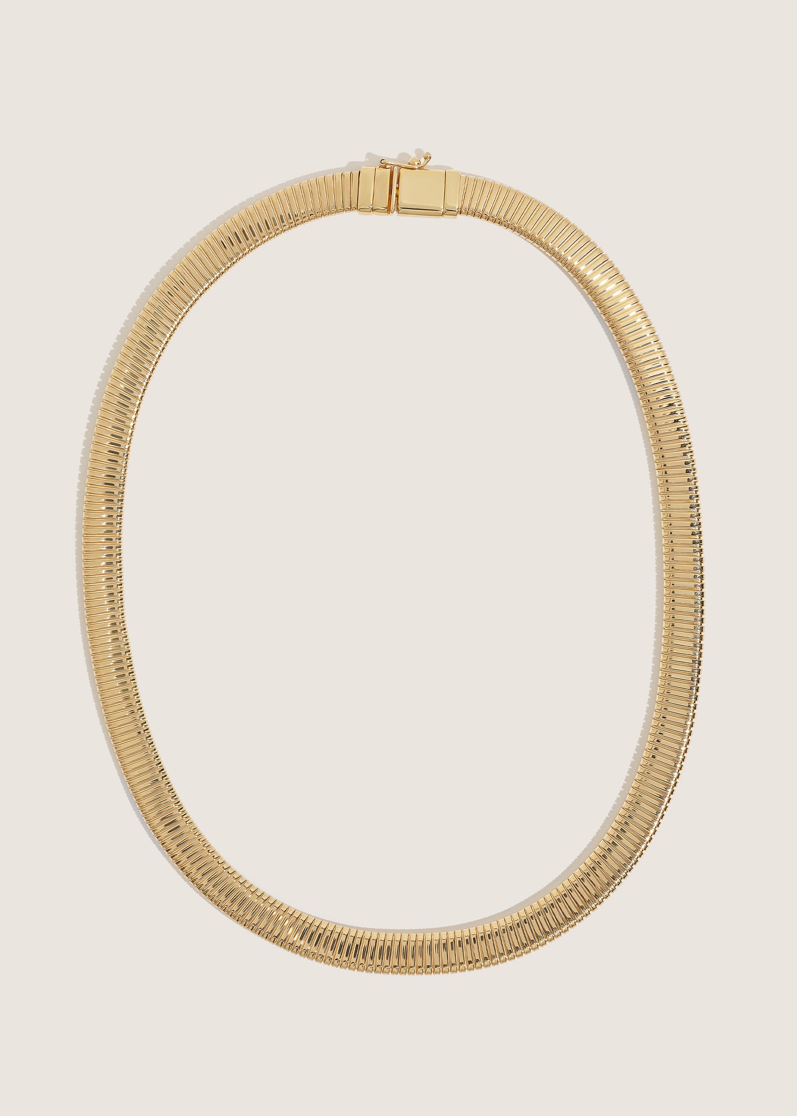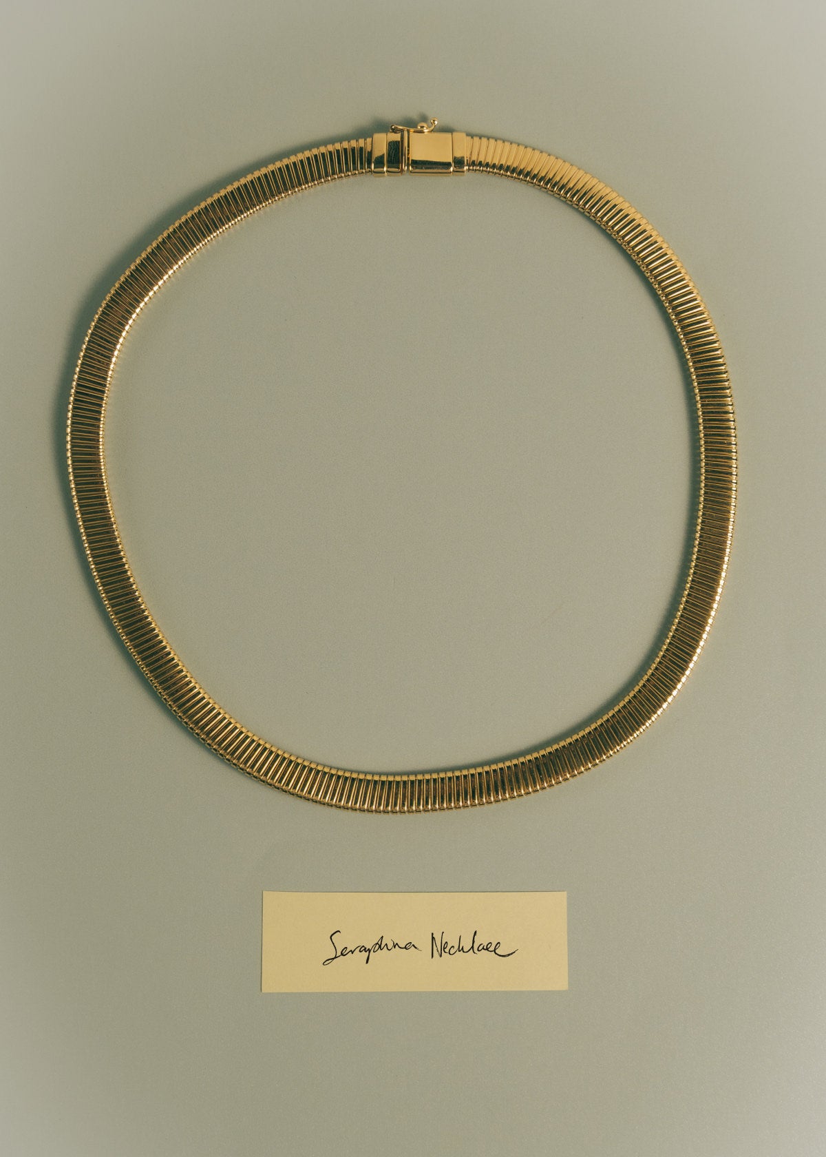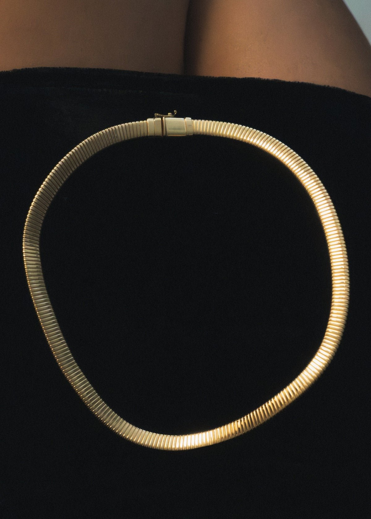 A study in fluid form and vintage allure. The Seraphina Flat Tubogas Necklace drapes like liquid gold, sculpted from interlocking coils that move with the body. Inspired by mid-century Italian design, its sleek, flat silhouette sits close to the skin—modern yet timeless. Finished with a delicate butterfly clasp for a seamless closure and a touch of refinement.